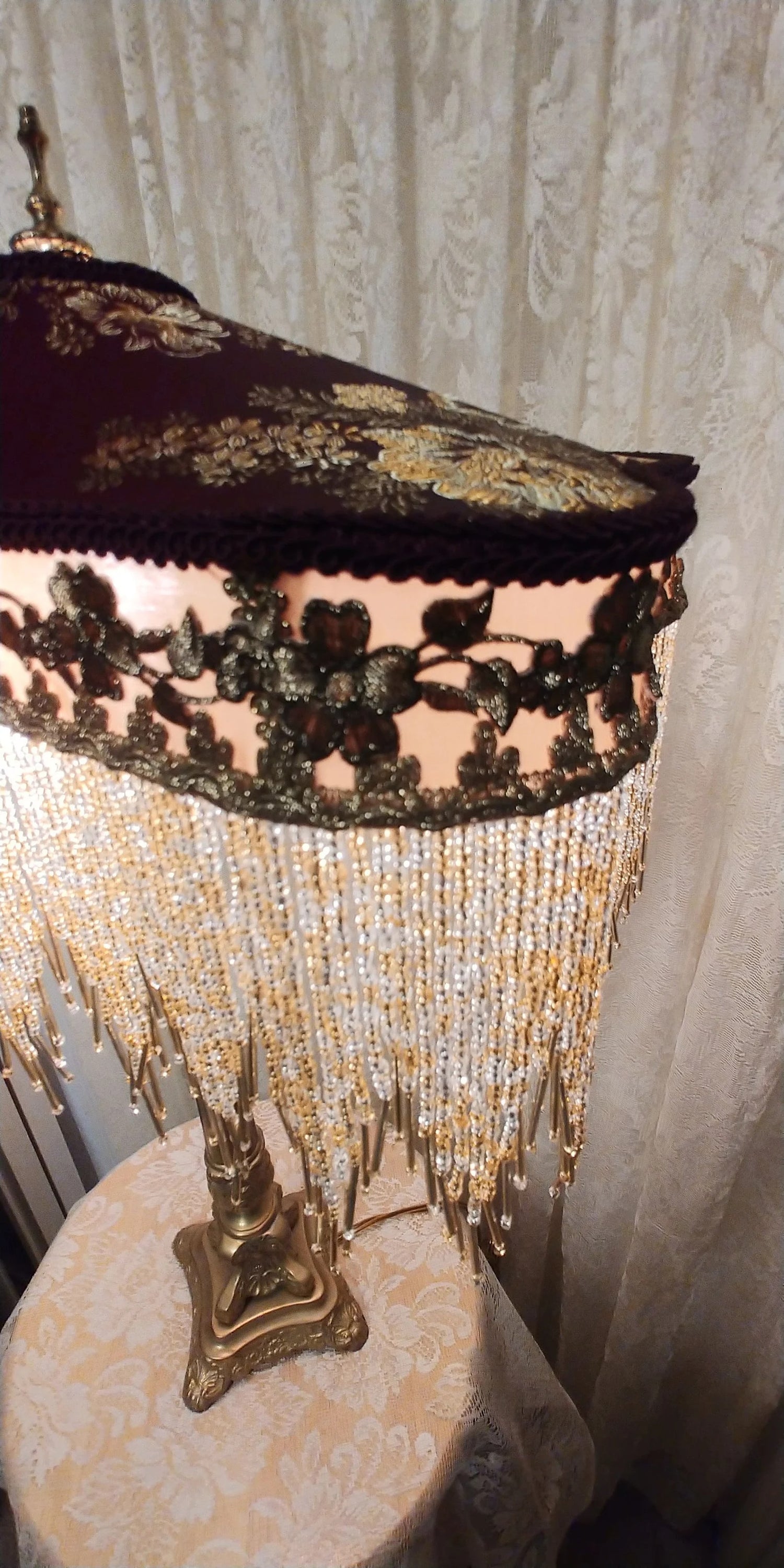 Unique Asian Influence Red Silk Shade with beautiful Golden All Glass bead fringe and special metalic trim accent, framed in bottom cuff. This is one of a kind Lamp and shade. 22" HT. 18" wide shade, oval bottom is 10" front to back, 3" top circle. Nice heavy brass lamp.