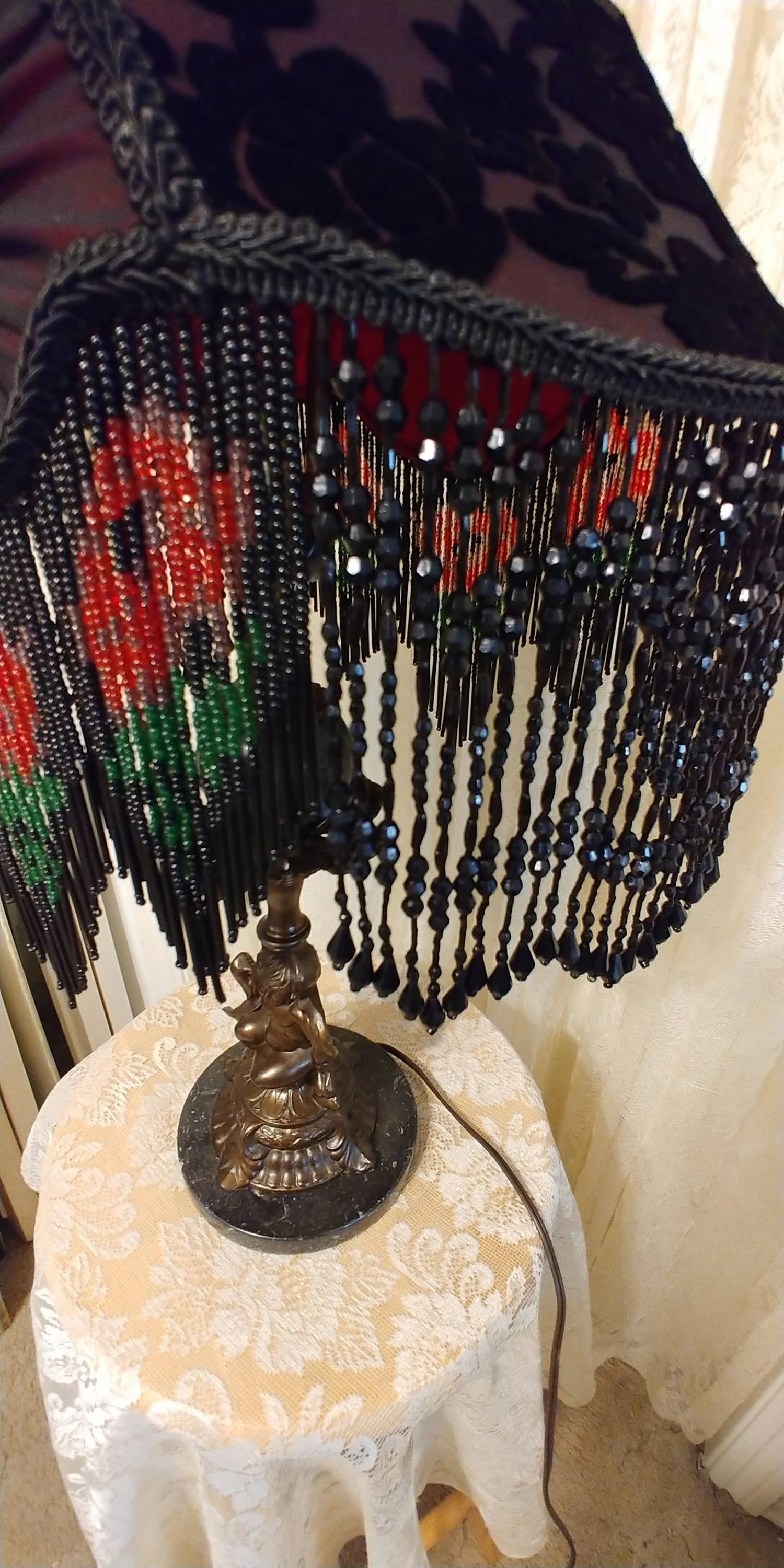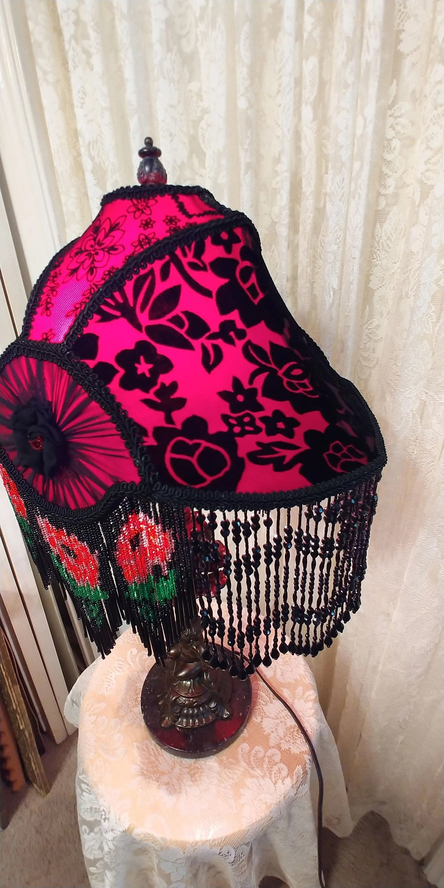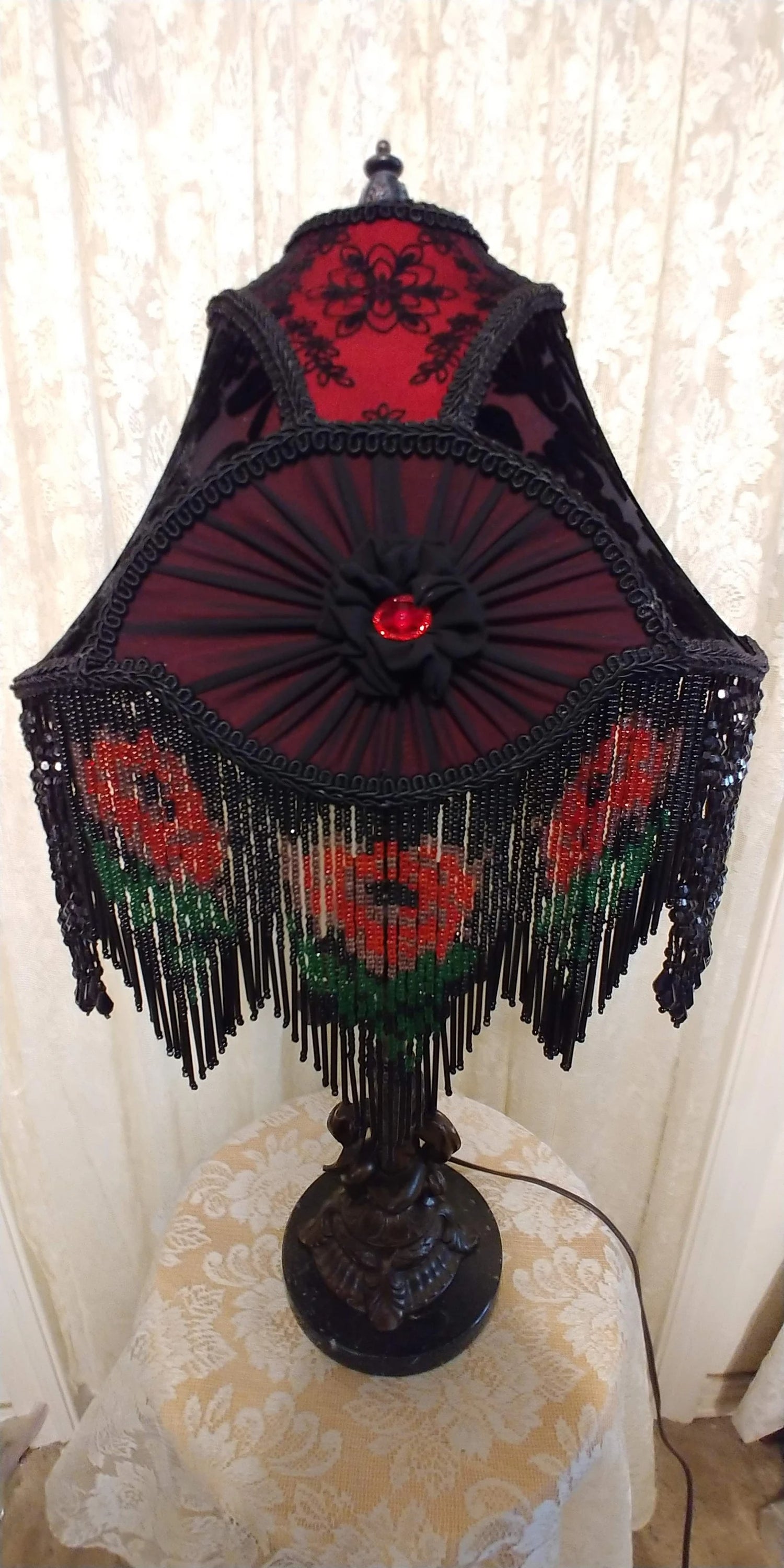 Gothic Style 23" black accent Marble on Vintage Lamp base, with Crimson & Black Silk Velvet Floral design Lampshade, with Black Rosettes and Crimson rosette center to compliment the 6" long Glass bead Flower Fringe centered with 5" compliment Jet Black Bead fringe sides. Black Burned-out Velvet Side Panels. Truly One of a Kind!
