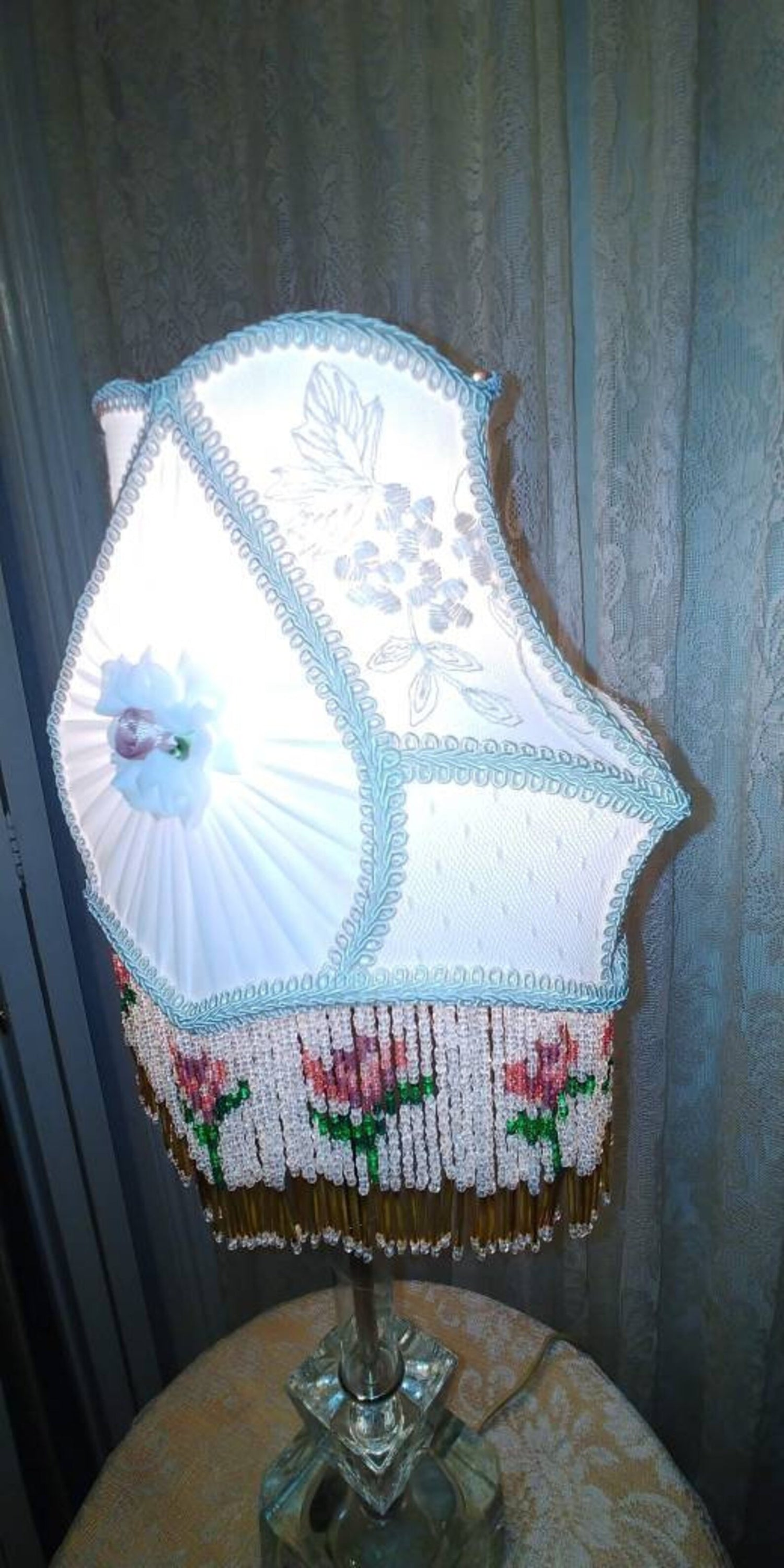 with Hand Sewn white Silk Victorian style Lampshade and all glass 3 inch floral bead fringe. Hand sewn, also has embroidery side panels and ribbon rose center on silk rosettes. One of a kind